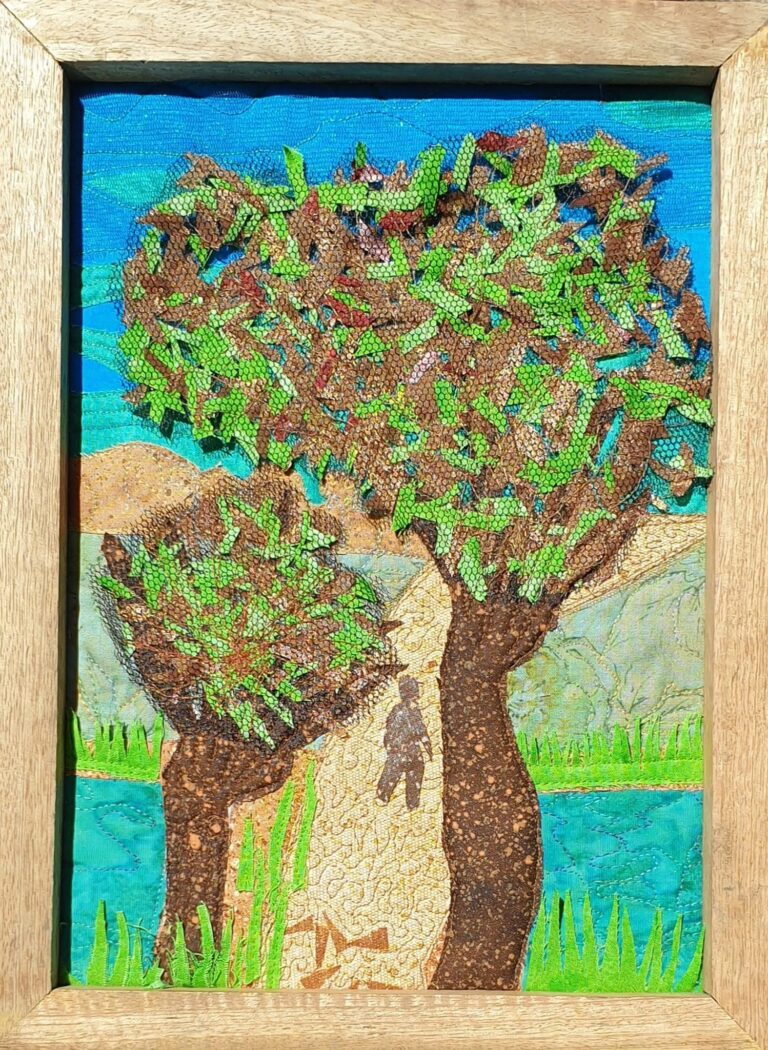Bij de bomen op deze quilt is de snippertechniek gebruikt. Door kleine snippers stof onder de organza te stikken ontstaat een blader dak.