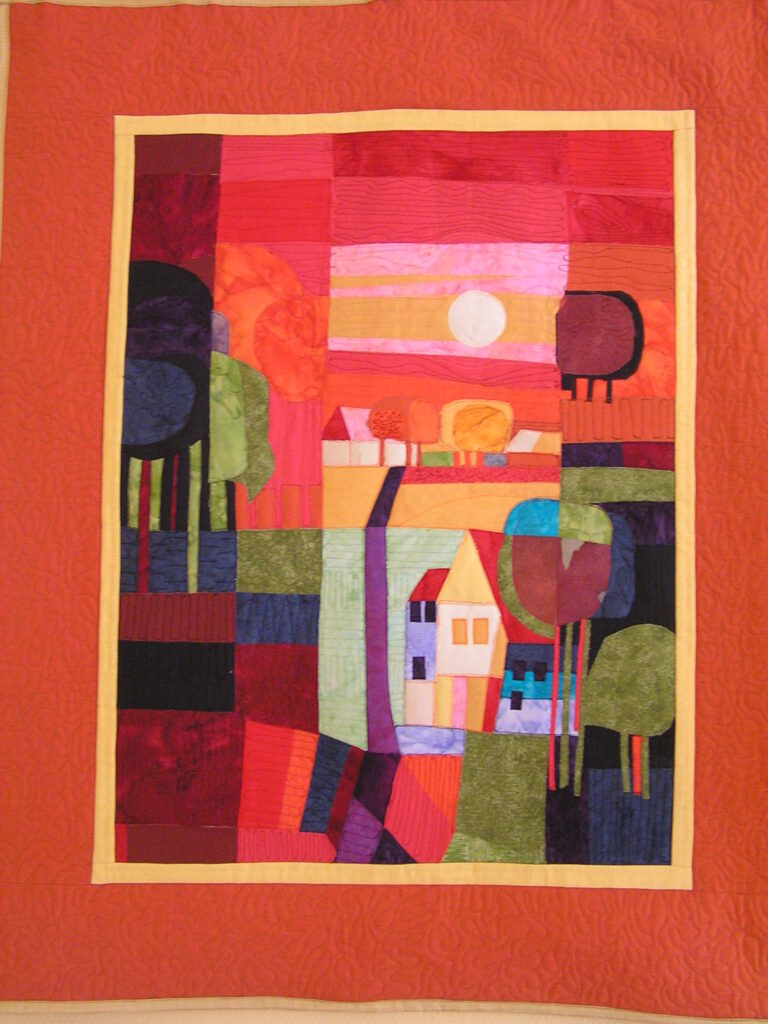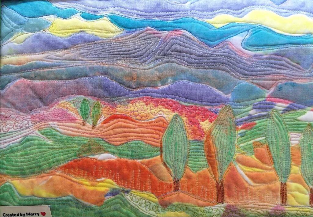 Dit quiltje is ontstaan nadat ik stof geverfd heb met transferverf. Door de contouren met stikseld te accentueren ontstaat er een landschap.