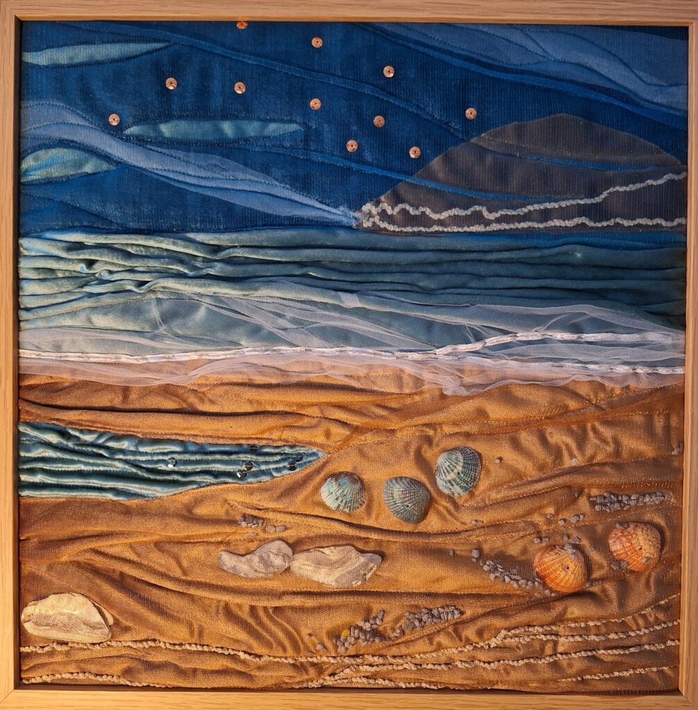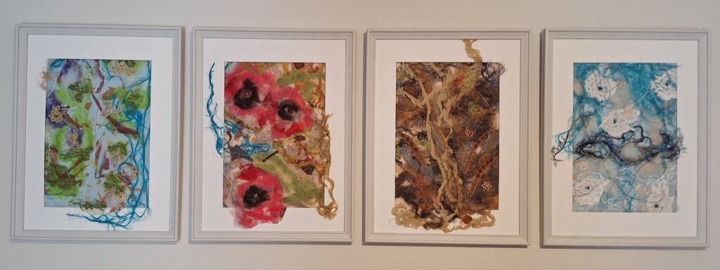 In deze art quilts zijn stofjes, draadjes, ruwe wol en kraaltjes verwerkt. Ik heb geplakt en genaaid, zo ontstonden Lente, Zomer, Herfst en Winter.