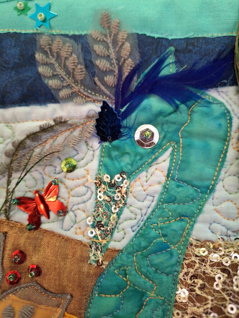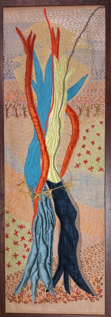 Deze schets heb ik uitgewerkt. De bomen van fluweel zijn gestikt op een jute ondergrond.